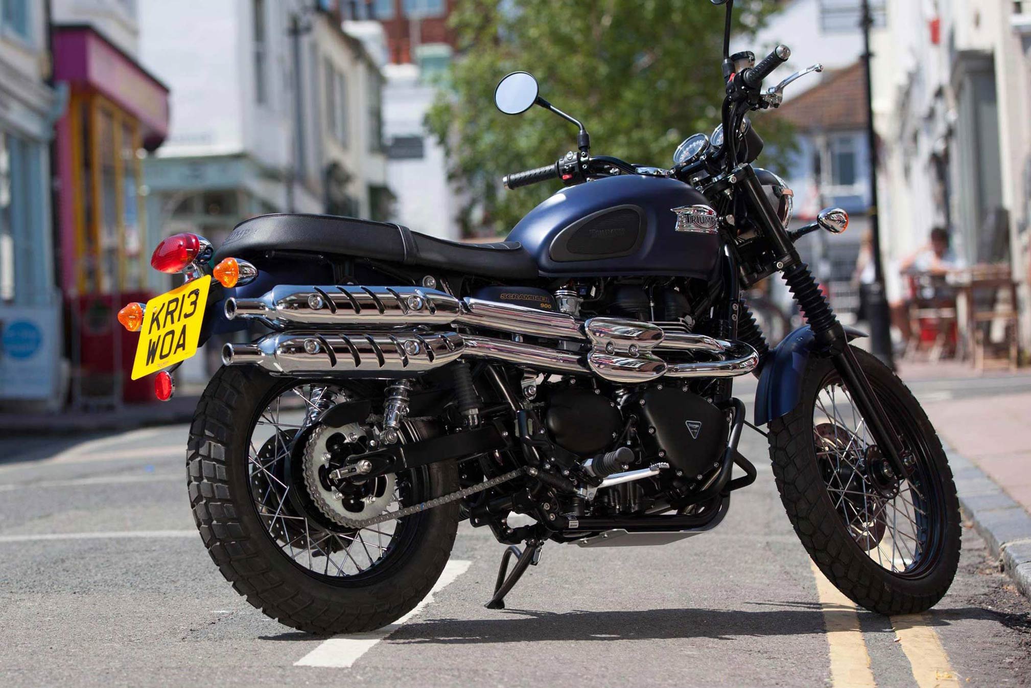 In the 1960s, far from civilisation and regular roads, stripped down desert bikes based on Triumph twins and fitted with high level exhausts, dirt bike tyres and suspension were being used for hard recreational fun and competition on tough terrain. The Scrambler takes its inspiration from these custom bikes.