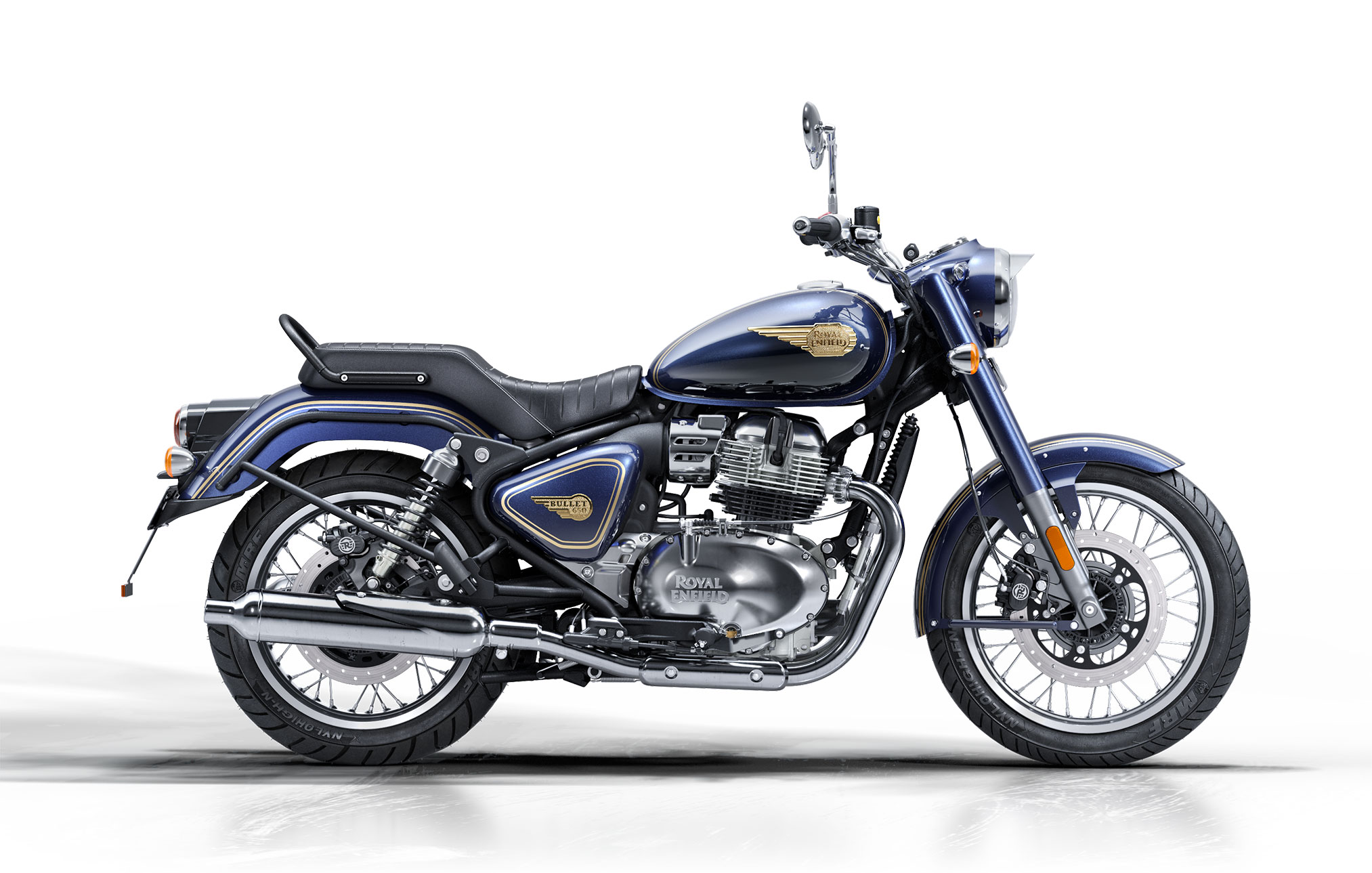 Hand-painted gold pinstripes. Gleaming, winged 3D badging. The body of the Bullet 650 pays tribute to its iconic DNA.